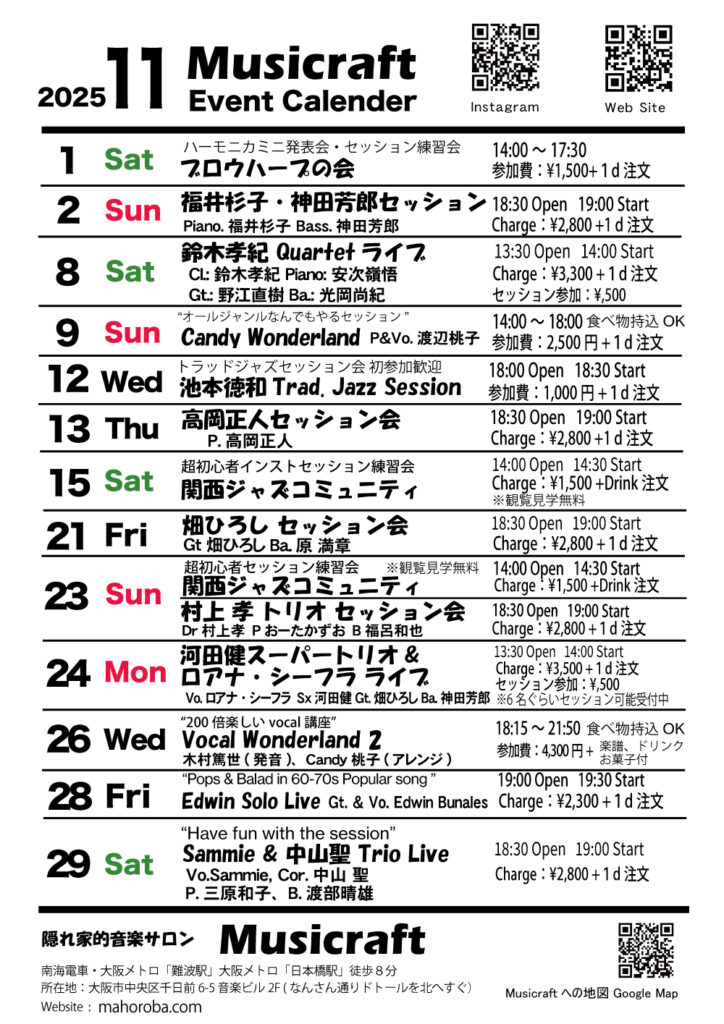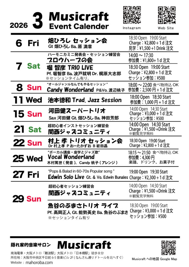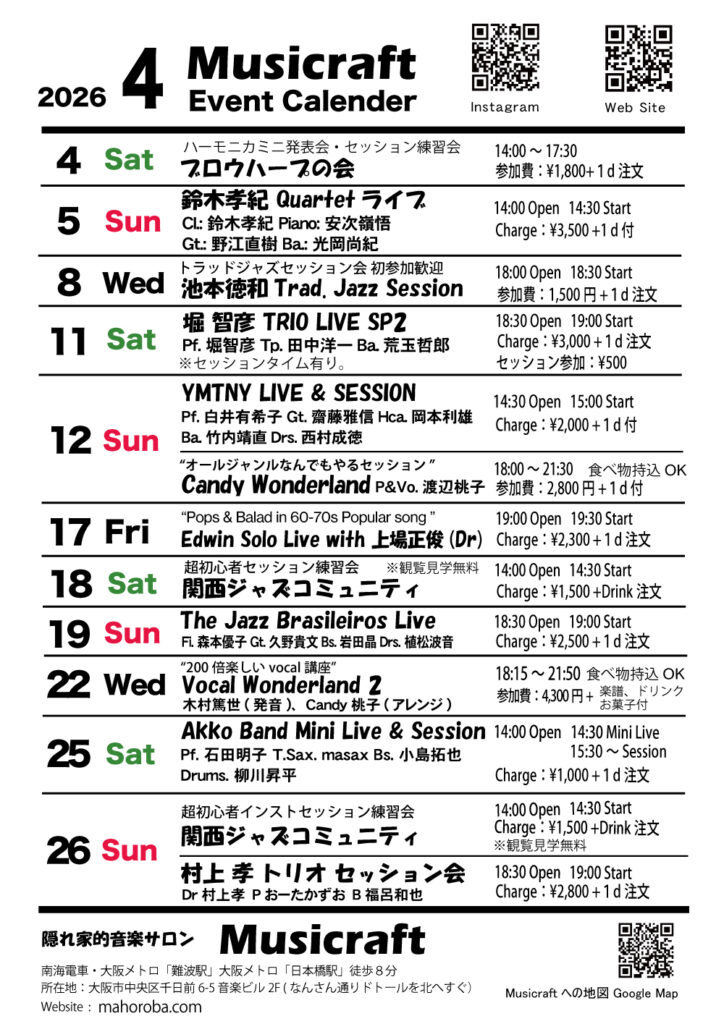You can enjoy jazz musicians who are active mainly in Osaka and the Kansai region at a casual and reasonable price. Many live shows include session time, so you can enjoy joining in the sessions on vocals, guitar, bass, saxophone, drums, piano, or any other instrument.【Monthly Live】