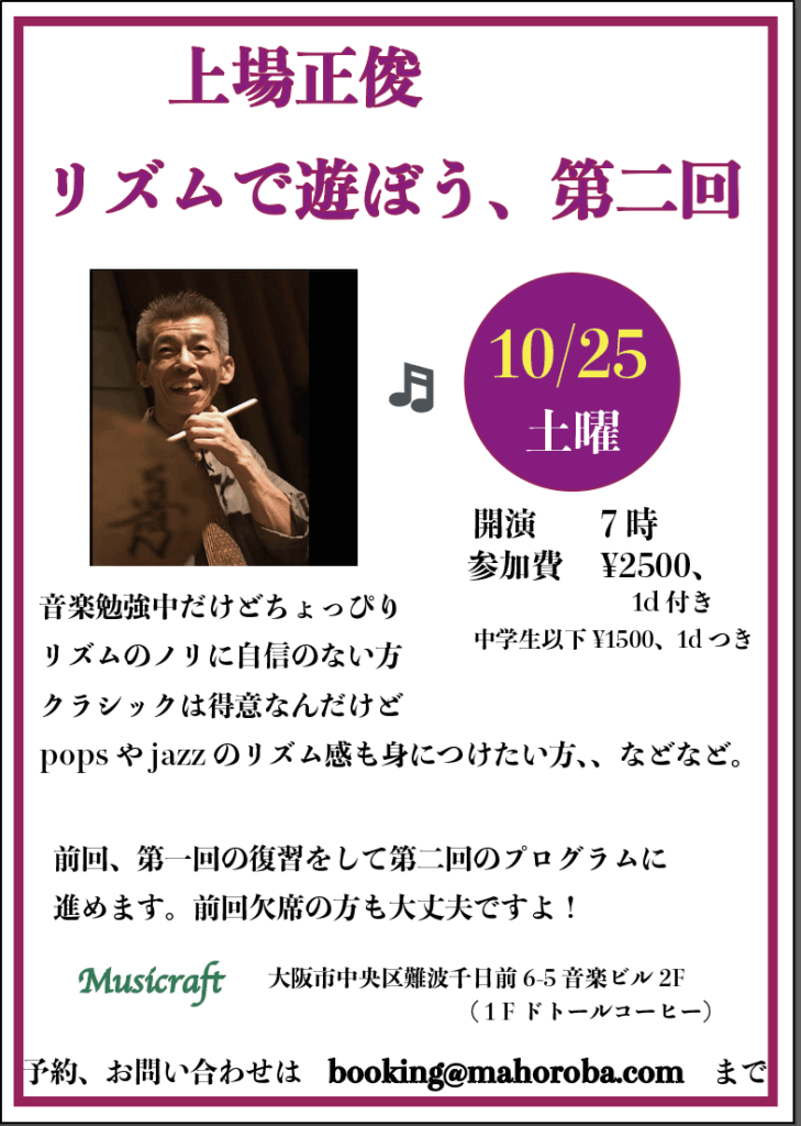 10/25(土) 上場正俊 リズムで遊ぼう #2 2025年10月14日 最終更新日時 : 2025年10月14日 ongaku.bldg ライブのご予約はこちらのフォームでお申し込みください。 To book/attend a jazz/jam by Osaka musicians, please fill out this form. 氏名(必須)/ Name (required) フリガナ / Furigana (Only for Japanese) 電話番号(必須)/ Telephone (required) メールアドレス(必須)/ E-mail (required) ライブ開催日(必須)/ Live date (Select from calender icon 年:Year/月:Month/日:Date, required) ライブタイトル(必須)/ Live title (required) ご予約人数(必須)/ Number of people in reservation (required) 12345678910 セッション参加(必須)/ Join a Jam Session (required) セッション参加/Join jam session不参加/Not join 楽器(必須)/ Your musical instrument (required) 選択ボーカル/Vocalピアノ/Pianoギター/Guitarベース/Bassドラム/Drumsハーモニカ/Harmonicaトロンボーン/Tromboneサックス/Saxophoneクラリネット/Clarinetトランペット/Trumpetフルート/Fluteバイオリン/Violinその他/e.t.c. メッセージ本文 (任意)/ Your message to us (if any) セキュリティの為、フォーム内に『Osaka』の文字を入力してください。/For security reasons, please enter the word "Osaka" in the below form. Δ \ 最新情報をチェック /