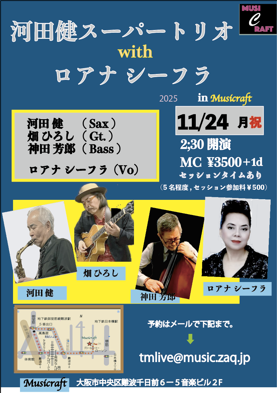 11/24(月・祝) 河田健スーパートリオ&ロアナ・シーフラライブ
