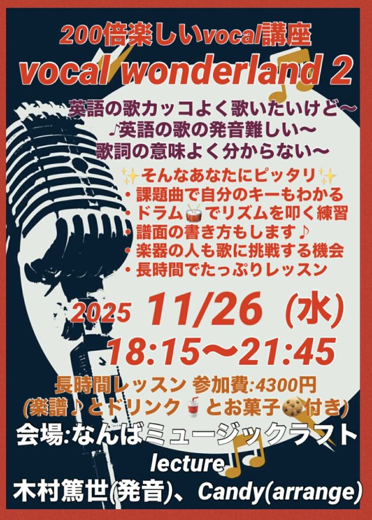 11/26 (水) vocal wonderland 200倍楽しいvocal講座 2025年11月2日 最終更新日時 : 2025年11月2日 ongaku.bldg ライブのご予約はこちらのフォームでお申し込みください。 To book/attend a jazz/jam by Osaka musicians, please fill out this form. 氏名(必須)/ Name (required) フリガナ / Furigana (Only for Japanese) 電話番号(必須)/ Telephone (required) メールアドレス(必須)/ E-mail (required) ライブ開催日(必須)/ Live date (Select from calender icon 年:Year/月:Month/日:Date, required) ライブタイトル(必須)/ Live title (required) ご予約人数(必須)/ Number of people in reservation (required) 12345678910 セッション参加(必須)/ Join a Jam Session (required) セッション参加/Join jam session不参加/Not join 楽器(必須)/ Your musical instrument (required) 選択ボーカル/Vocalピアノ/Pianoギター/Guitarベース/Bassドラム/Drumsハーモニカ/Harmonicaトロンボーン/Tromboneサックス/Saxophoneクラリネット/Clarinetトランペット/Trumpetフルート/Fluteバイオリン/Violinその他/e.t.c. メッセージ本文 (任意)/ Your message to us (if any) セキュリティの為、フォーム内に『Osaka』の文字を入力してください。/For security reasons, please enter the word "Osaka" in the below form. Δ \ 最新情報をチェック /