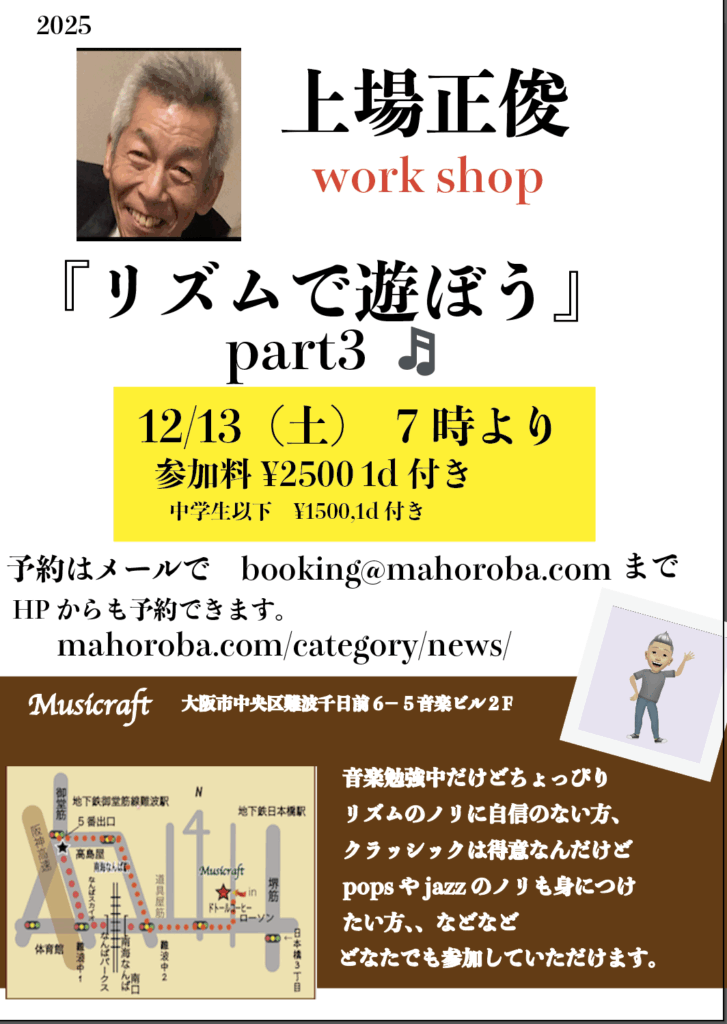 12/13(土) 上場正俊 リズムで遊ぼう #3 2025年12月2日 最終更新日時 : 2025年12月2日 ongaku.bldg ライブのご予約はこちらのフォームでお申し込みください。 To book/attend a jazz/jam by Osaka musicians, please fill out this form. 氏名(必須)/ Name (required) フリガナ / Furigana (Only for Japanese) 電話番号(必須)/ Telephone (required) メールアドレス(必須)/ E-mail (required) ライブ開催日(必須)/ Live date (Select from calender icon 年:Year/月:Month/日:Date, required) ライブタイトル(必須)/ Live title (required) ご予約人数(必須)/ Number of people in reservation (required) 12345678910 セッション参加(必須)/ Join a Jam Session (required) セッション参加/Join jam session不参加/Not join 楽器(必須)/ Your musical instrument (required) 選択ボーカル/Vocalピアノ/Pianoギター/Guitarベース/Bassドラム/Drumsハーモニカ/Harmonicaトロンボーン/Tromboneサックス/Saxophoneクラリネット/Clarinetトランペット/Trumpetフルート/Fluteバイオリン/Violinその他/e.t.c. メッセージ本文 (任意)/ Your message to us (if any) セキュリティの為、フォーム内に『Osaka』の文字を入力してください。/For security reasons, please enter the word "Osaka" in the below form. Δ \ 最新情報をチェック /
