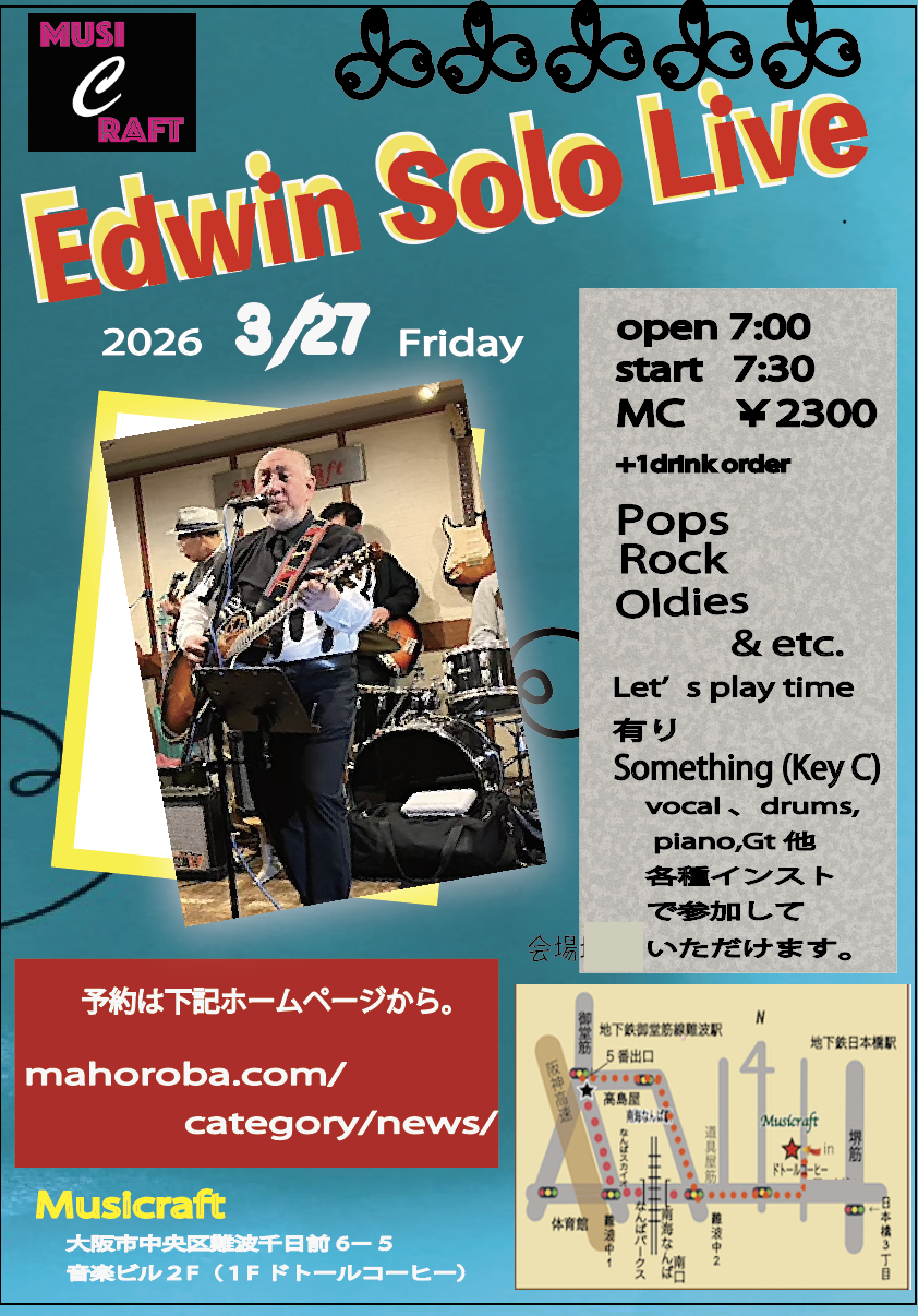 3/27(金) Edwin Solo Live 2026年3月3日 最終更新日時 : 2026年3月13日 ongaku.bldg Friday, March 27, Edwin Solo LiveMusicians:Gt.Vo.Edwin Bunales playing American Pops 70’~80’sOpen: 19:00 / Start: 19:30Music Charge : JPY2,300 Drink: 1 drink order rquiredセッション参加歓迎/Jam session participation is welcome. ライブのご予約はこちらのフォームでお申し込みください。 To book/attend a jazz/jam by Osaka musicians, please fill out this form. 氏名(必須)/ Name (required) フリガナ / Furigana (Only for Japanese) 電話番号(必須)/ Telephone (required) メールアドレス(必須)/ E-mail (required) ライブ開催日(必須)/ Live date (Select from calender icon 年:Year/月:Month/日:Date, required) ライブタイトル(必須)/ Live title (required) ご予約人数(必須)/ Number of people in reservation (required) 12345678910 セッション参加(必須)/ Join a Jam Session (required) セッション参加/Join jam session不参加/Not join 楽器(必須)/ Your musical instrument (required) 選択ボーカル/Vocalピアノ/Pianoギター/Guitarベース/Bassドラム/Drumsハーモニカ/Harmonicaトロンボーン/Tromboneサックス/Saxophoneクラリネット/Clarinetトランペット/Trumpetフルート/Fluteバイオリン/Violinその他/e.t.c. メッセージ本文 (任意)/ Your message to us (if any) セキュリティの為、フォーム内に『Osaka』の文字を入力してください。/For security reasons, please enter the word "Osaka" in the below form. Δ \ 最新情報をチェック /