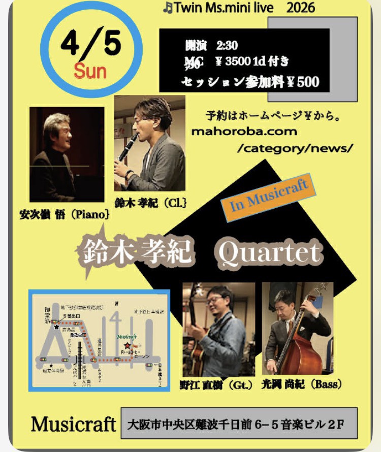 4/5(日) 鈴木孝紀 Quartetライブ