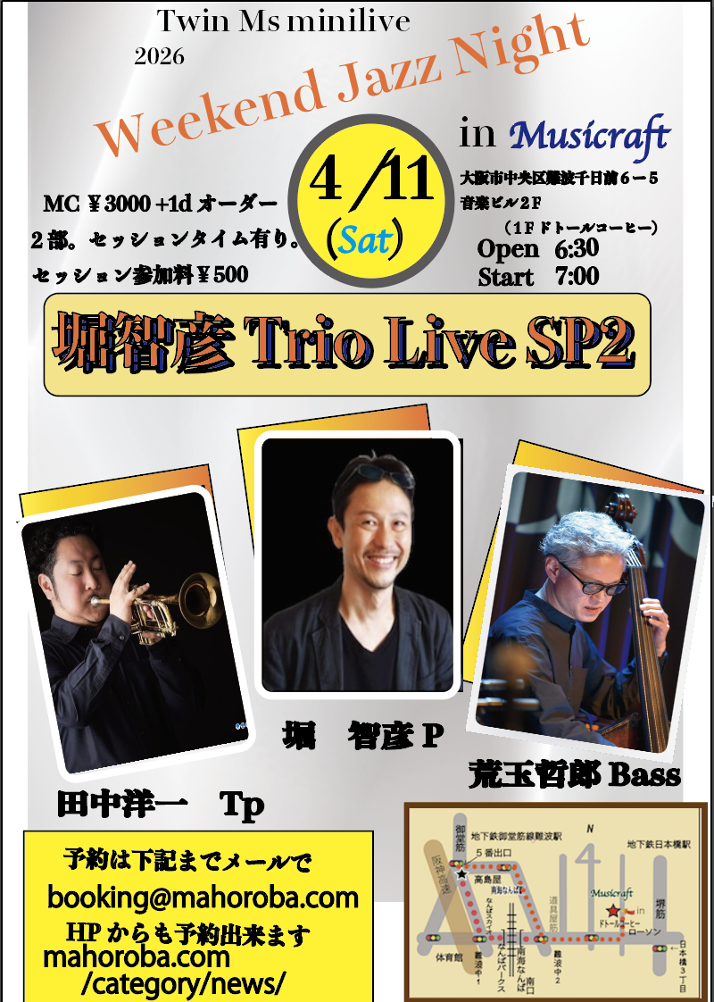 3/7(土) 堀智彦 TRIO LIVE SP2 2026年4月3日 最終更新日時 : 2026年4月3日 ongaku.bldg ライブのご予約はこちらのフォームでお申し込みください。 To book/attend a jazz/jam by Osaka musicians, please fill out this form. 氏名(必須)/ Name (required) フリガナ / Furigana (Only for Japanese) 電話番号(必須)/ Telephone (required) メールアドレス(必須)/ E-mail (required) ライブ開催日(必須)/ Live date (Select from calender icon 年:Year/月:Month/日:Date, required) ライブタイトル(必須)/ Live title (required) ご予約人数(必須)/ Number of people in reservation (required) 12345678910 セッション参加(必須)/ Join a Jam Session (required) セッション参加/Join jam session不参加/Not join 楽器(必須)/ Your musical instrument (required) 選択ボーカル/Vocalピアノ/Pianoギター/Guitarベース/Bassドラム/Drumsハーモニカ/Harmonicaトロンボーン/Tromboneサックス/Saxophoneクラリネット/Clarinetトランペット/Trumpetフルート/Fluteバイオリン/Violinその他/e.t.c. メッセージ本文 (任意)/ Your message to us (if any) セキュリティの為、フォーム内に『Osaka』の文字を入力してください。/For security reasons, please enter the word "Osaka" in the below form. Δ \ 最新情報をチェック /