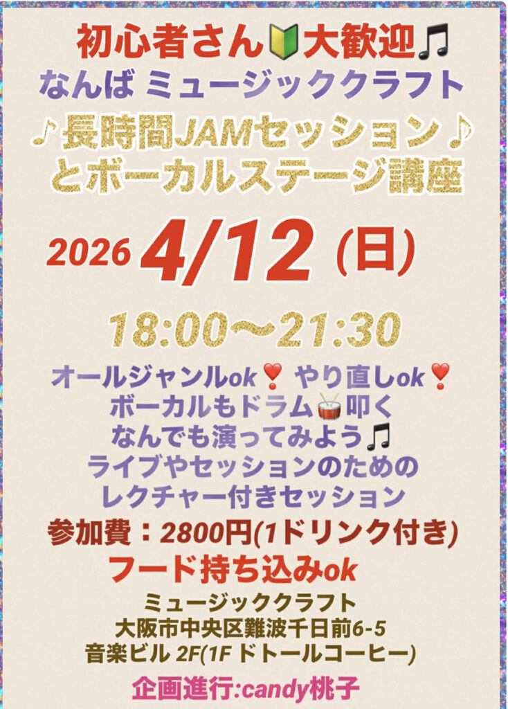 4/12 (日) Candy Wonder Land なんでもやるセッション 2026年4月3日 最終更新日時 : 2026年4月3日 ongaku.bldg ライブのご予約はこちらのフォームでお申し込みください。 To book/attend a jazz/jam by Osaka musicians, please fill out this form. 氏名(必須)/ Name (required) フリガナ / Furigana (Only for Japanese) 電話番号(必須)/ Telephone (required) メールアドレス(必須)/ E-mail (required) ライブ開催日(必須)/ Live date (Select from calender icon 年:Year/月:Month/日:Date, required) ライブタイトル(必須)/ Live title (required) ご予約人数(必須)/ Number of people in reservation (required) 12345678910 セッション参加(必須)/ Join a Jam Session (required) セッション参加/Join jam session不参加/Not join 楽器(必須)/ Your musical instrument (required) 選択ボーカル/Vocalピアノ/Pianoギター/Guitarベース/Bassドラム/Drumsハーモニカ/Harmonicaトロンボーン/Tromboneサックス/Saxophoneクラリネット/Clarinetトランペット/Trumpetフルート/Fluteバイオリン/Violinその他/e.t.c. メッセージ本文 (任意)/ Your message to us (if any) セキュリティの為、フォーム内に『Osaka』の文字を入力してください。/For security reasons, please enter the word "Osaka" in the below form. Δ \ 最新情報をチェック /