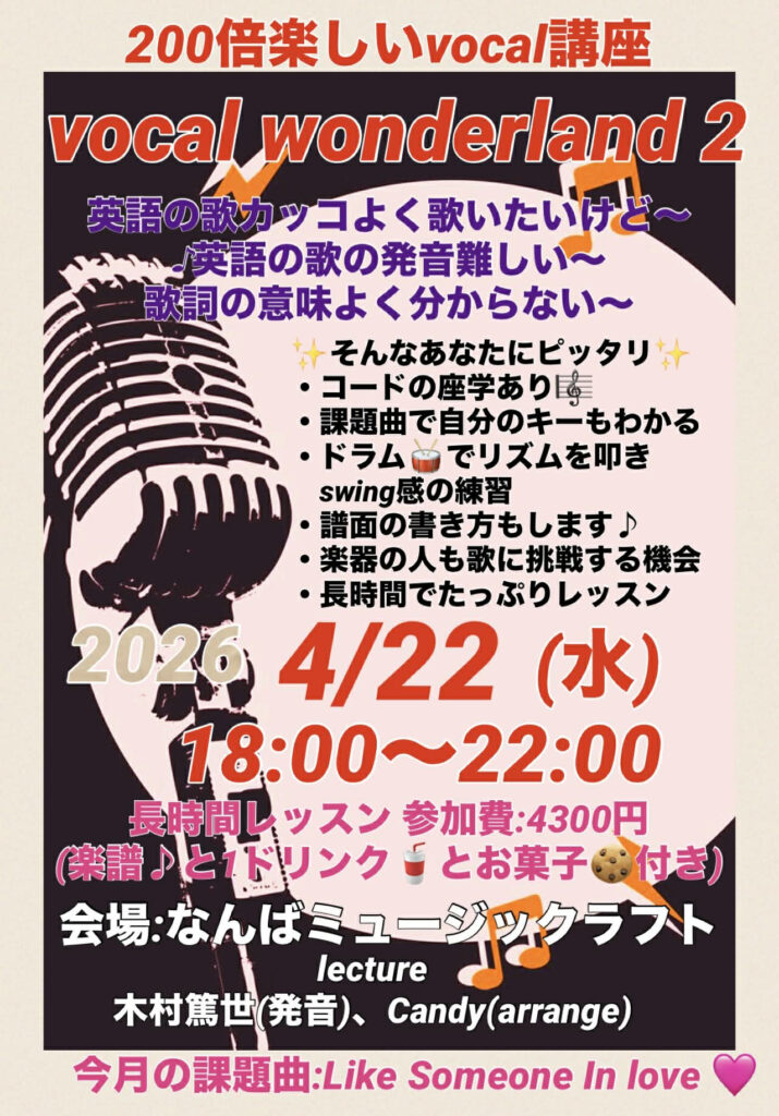 4/22 (水) vocal wonderland 200倍楽しいvocal講座 2026年4月3日 最終更新日時 : 2026年4月3日 ongaku.bldg ライブのご予約はこちらのフォームでお申し込みください。 To book/attend a jazz/jam by Osaka musicians, please fill out this form. 氏名(必須)/ Name (required) フリガナ / Furigana (Only for Japanese) 電話番号(必須)/ Telephone (required) メールアドレス(必須)/ E-mail (required) ライブ開催日(必須)/ Live date (Select from calender icon 年:Year/月:Month/日:Date, required) ライブタイトル(必須)/ Live title (required) ご予約人数(必須)/ Number of people in reservation (required) 12345678910 セッション参加(必須)/ Join a Jam Session (required) セッション参加/Join jam session不参加/Not join 楽器(必須)/ Your musical instrument (required) 選択ボーカル/Vocalピアノ/Pianoギター/Guitarベース/Bassドラム/Drumsハーモニカ/Harmonicaトロンボーン/Tromboneサックス/Saxophoneクラリネット/Clarinetトランペット/Trumpetフルート/Fluteバイオリン/Violinその他/e.t.c. メッセージ本文 (任意)/ Your message to us (if any) セキュリティの為、フォーム内に『Osaka』の文字を入力してください。/For security reasons, please enter the word "Osaka" in the below form. Δ \ 最新情報をチェック /